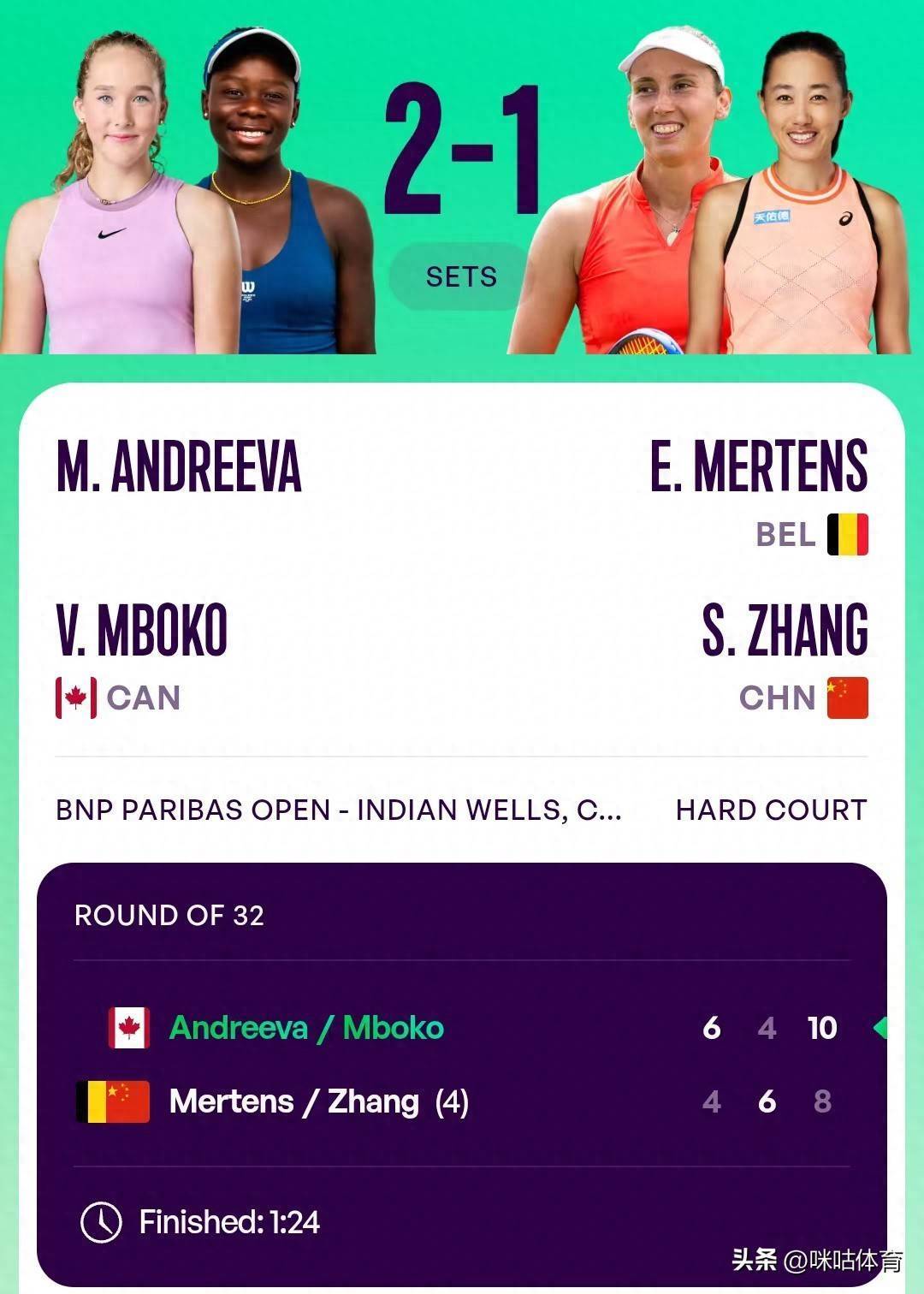WTA1000印第安维尔斯站女双首轮,中国金花张帅搭档比利时名将梅尔滕斯网络在线股票配资,迎战安德列娃/姆博科。最终双方鏖战三盘,张帅/梅尔滕斯以4-6、6-4、8-10惜败对手,决胜盘抢十两分憾负,遗憾止步赛事首轮,无缘晋级女双16强。